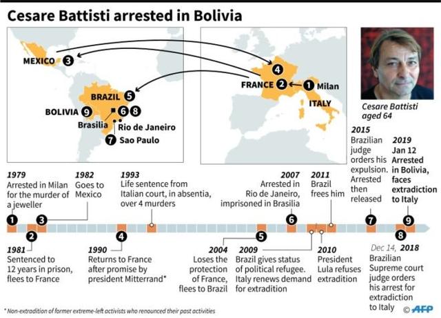 Jailed in 1979 for belonging to an armed revolutionary group outlawed in Italy, Battisti escaped from prison two years later, and has spent nearly four decades on the run.