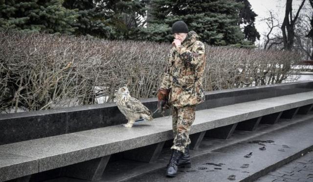 Denis Sidogin and eagle-owl Filya have replaced guards who used to shoot crows until they were told to stop wasting ammunition© AFP Alexander NEMENOV