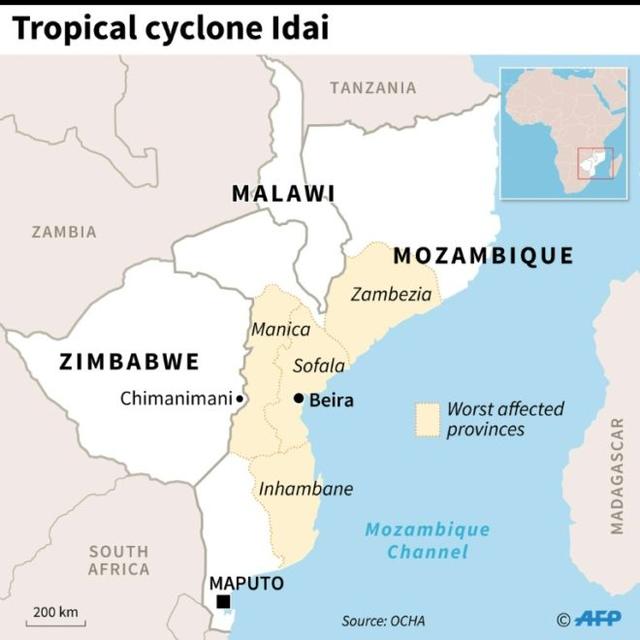 Map of Mozambique, Zimbabwe and Malawi, locating provinces worst hit by tropicl cycloe Idai© AFP Vincent LEFAI