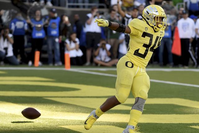EUGENE, OR - OCTOBER 13: Running back CJ Verdell #34 of the Oregon Ducks scores the winning touchdown in overtime of the game against the Washington Huskies at Autzen Stadium on October 13, 2018 in Eugene, Oregon. The Ducks won the game 30-27. | Photo by Steve Dykes/Getty Images
