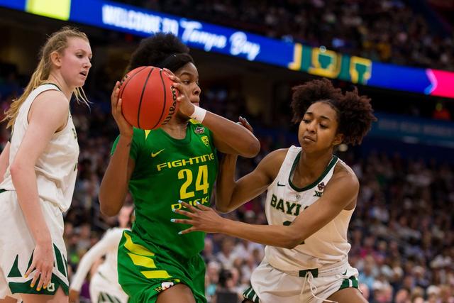 TAMPA, FL - APRIL 05: Oregon forward Ruthy Hebard (24) plays in 2019 NCAA Women’s National Semifinal Game One between the Oregon Ducks and the Baylor Bears at at Amelie Arena in Tampa, FL on on April 5. | Photo by Mary Holt/Icon Sportswire via Getty Images
