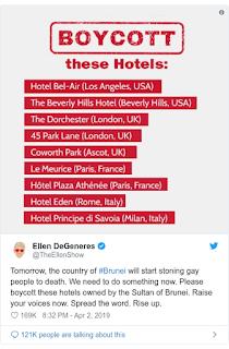 The social kickback seems to have heightened after US anchor person Ellen DeGeneres shared a Twitter post naming the nine Brunei-claimed inns to blacklist.