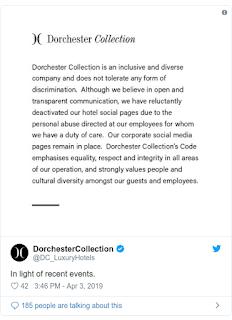 In any case these remarks may have incited Dorchester Collection to make their web based life accounts blocked off, as it refered to "individual maltreatment coordinated at our workers" in its choice.