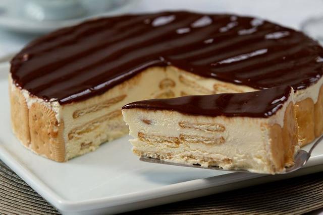 Outra de biscoitos molhados no leite, intercalando as camadas até finalizar com biscoitos.