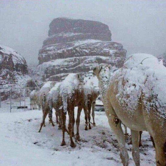 Saudi Arabia’s deserts have been covered in a blanket of snow as temperatures plummeted across parts of the Middle East. Bizarre photos show camels covered in snow and locals – who normally face blistering temperatures – picking up and throwing the snow.