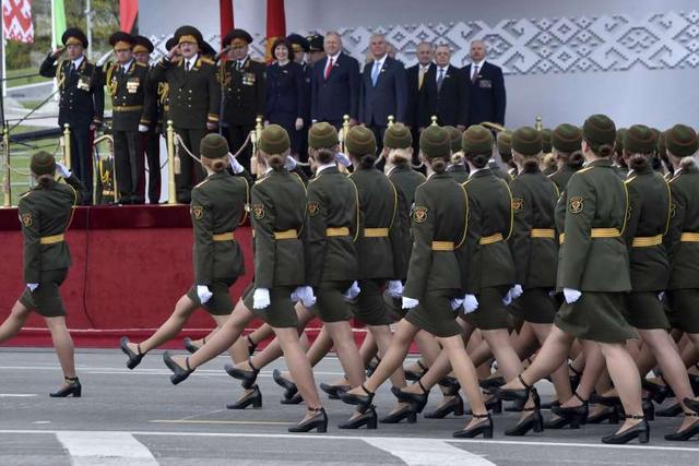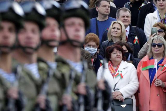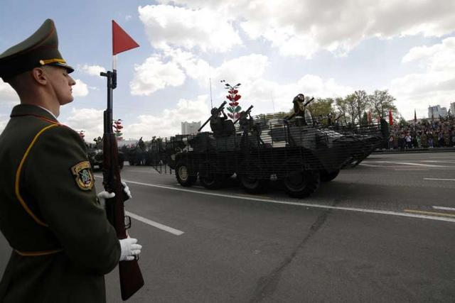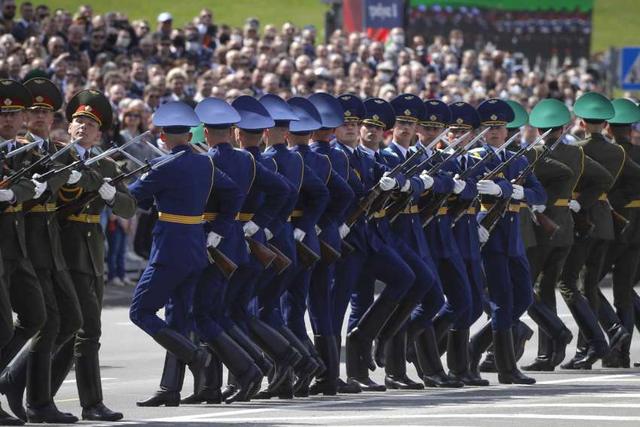 Tens of thousands of spectators lined the parade route as some 3,000 soldiers and 185 military vehicles passed by in the capital, Minsk.