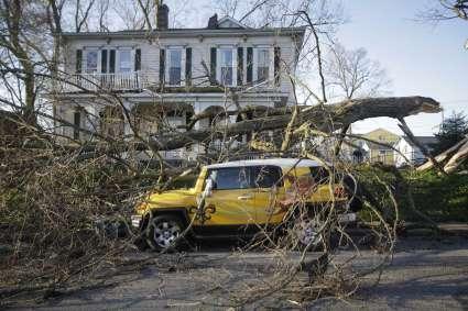 In the central Indiana community of Mooresville, about 15 miles (24 kilometers) southwest of Indianapolis, bricks were scattered along the town’s main downtown thoroughfare and traffic was blocked by debris. Police Officer Brock A. Chipman told WISH-TV that the storm knocked the second story off a two-story vacant building, and one woman was slightly injured after power lines fell on her car.