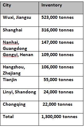 The current status of primary aluminium inventories across China is given in the chart below: