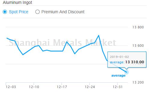 A00 aluminium ingot price dropped RMB 130 per tonne to RMB 13,310 per tonne on January 2.Today, the average prices are expected to range between RMB 13,290 per tonne and RMB 13,330 per tonne, with spot discounts to settle at RMB 100 per tonne to RMB 60 per tonne.