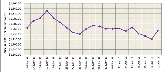 As on June 11, Tuesday, LME aluminium cash (bid) price stood at US$ 1754 per tonne, LME official settlement price stands at US$ 1754.50 per tonne; 3-months bid price stands at US$ 1783 per tonne, 3-months offer price is US$ 1784 per tonne; Dec 20 bid price stands at US$ 1903 per tonne, and Dec 20 offer price stands at US$ 1908 per tonne.