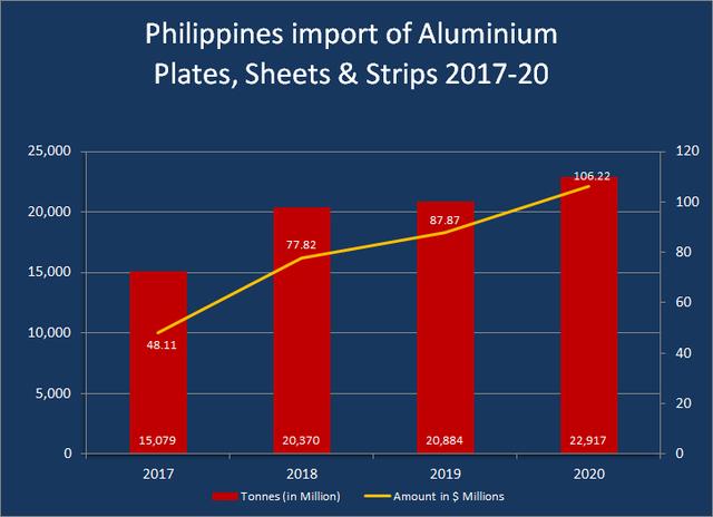 In 2017 the aluminium plates, sheets & strips import stood at 15,079 tonnes, whereas in 2018 it raised to 20,370 tonnes, a growth by 35.08%, with Y-o-Y excess volume of 5,291 tonnes.