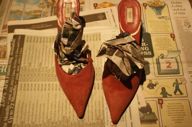 Encharque folhas de jornal com álcool e enfie dentro do sapato. Coloque bastante e aperte bem, até não caber mais. O álcool vai evaporar em pouco tempo e o jornal vai se expandir lá dentro, deixando seu sapato muito mais confortável!