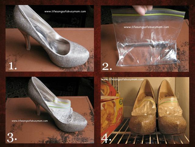 Encha sacos plásticos (tipo zip) com água e coloque os saquinhos dentro da forma dos sapatos de maneira que eles preencham toda a superfície, como se fossem pés. Os sacos devem ficar apertados, portanto vale ir enchendo de água e testando. Então basta colocas os sapatos no freezer, esperar a água virar gelo. Depois retire os sapatos, espere o gelo derreter um pouco, retire os sacos e pronto!.