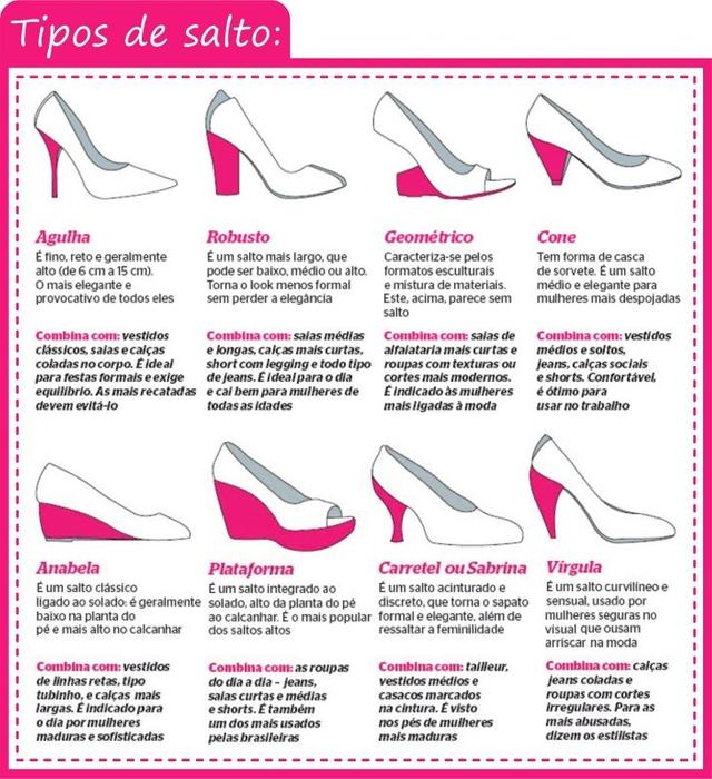 Existem vários modelos de salto e a moda cada vez mais abrange essa variedade numa mesma estação. Além de bonita você precisa se sentir confortável, caso precise de mais apoio na base, escolha os saltos mais quadrados e largos. Saltos mega altos e de extremamente finos, como o salto agulha, são verdadeiros desafios de equilíbrio.