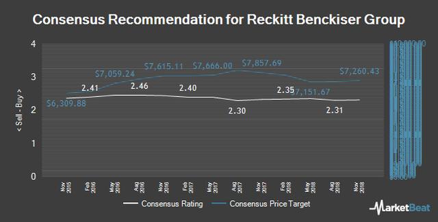 Several other research firms also recently issued reports on RB. Jefferies Financial Group restated a “sell” rating and issued a GBX 5,000 ($65.77) price objective on shares of Reckitt Benckiser Group in a research note on Friday, November 15th. DZ Bank decreased their price objective on shares of Reckitt Benckiser Group from GBX 6,500 ($85.50) to GBX 6,000 ($78.93) and set a “hold” rating for the company in a research note on Thursday, October 31st. Sanford C. Bernstein set a GBX 7,600 ($99.97) target price on shares of Reckitt Benckiser Group and gave the company a “buy” rating in a report on Friday, October 18th. UBS Group raised shares of Reckitt Benckiser Group to a “hold” rating and reduced their target price for the company from GBX 6,500 ($85.50) to GBX 6,000 ($78.93) in a report on Wednesday, October 23rd. Finally, Barclays upped their target price on shares of Reckitt Benckiser Group from GBX 6,700 ($88.13) to GBX 7,000 ($92.08) and gave the company an “overweight” rating in a report on Wednesday, December 18th. Four equities research analysts have rated the stock with a sell rating, four have given a hold rating and nine have issued a buy rating to the company. The company presently has an average rating of “Hold” and a consensus price target of GBX 6,692.35 ($88.03).