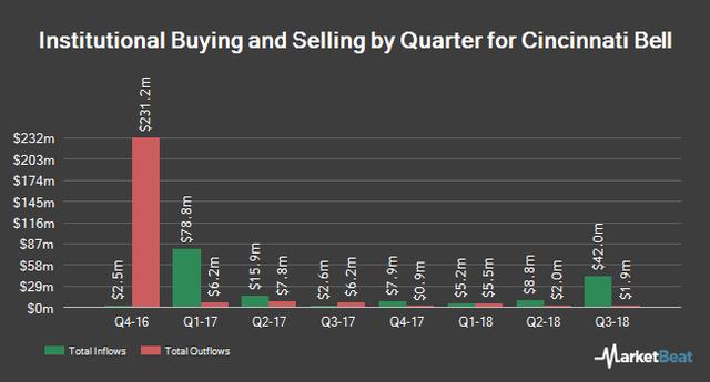 Several other institutional investors also recently bought and sold shares of CBB. Bank of Montreal Can raised its position in shares of Cincinnati Bell by 123.0% during the 2nd quarter. Bank of Montreal Can now owns 5,616 shares of the utilities provider’s stock valued at $28,000 after buying an additional 3,098 shares in the last quarter. Tower Research Capital LLC TRC raised its position in Cincinnati Bell by 86.1% in the 3rd quarter. Tower Research Capital LLC TRC now owns 5,564 shares of the utilities provider’s stock worth $28,000 after purchasing an additional 2,574 shares during the period. Quantamental Technologies LLC purchased a new position in Cincinnati Bell in the 2nd quarter worth $42,000. Marshall Wace LLP purchased a new position in Cincinnati Bell in the 2nd quarter worth $64,000. Finally, Wedbush Securities Inc. purchased a new position in Cincinnati Bell in the 2nd quarter worth $70,000. Hedge funds and other institutional investors own 98.26% of the company’s stock.