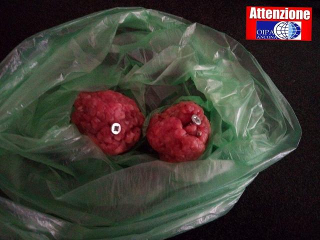Polpette di carne macinata con all'interno dei chiodi sono state trovate dagli operatori dell'Oipa in alcune zone del capoluogo. Letali se ingerite dai nostri amici a 4 zampe, sono state rinvenute in via Monte d'Ago ed in via Brecce Bianche, nella zona della chiesa. Altri bocconcini sono stati visti in piazza Salvo D'Acquisto e la stessa Oipa ha lanciato un allarme invitando i cittadini a segnalare eventuali nuovi avvistamenti.