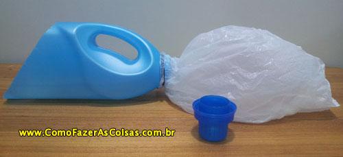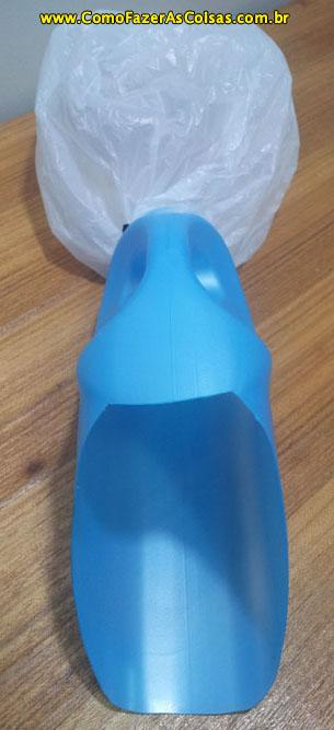 Se você quiser incrementar a sua pá, poderá adicionar um depósito de resíduos. Para isso retire a tampa da embalagem do amaciante e amarre a sacola plástica com o barbante no local da tampa.