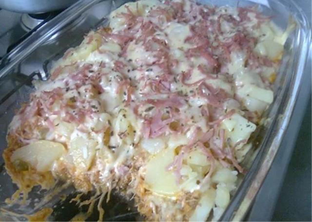 Refogue o molho de tomate com óleo e tempero em uma panela e acrescente o peito desfiado Coloque um pouco de água e deixe ferver um pouco Depois, adicione a azeitona picada e desligue o fogo Pegue um refratário de vidro e coloque o frango com o molho por baixo Logo em seguida coloque o requeijão por cima do frango e depois as batatas cozidas em rodelas Cubra com o presunto e a mussarela e polvilhe orégano por cima Leve ao forno preaquecido entre 180°C a 200°C até o que queijo derreter Sirva quente