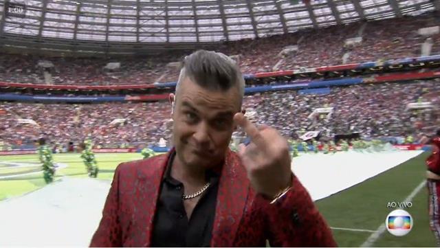 A grande atração da cerimônia de abertura foi o cantor Robbie Williams, que cantou alguns de seus sucessos no estádio Luzhniki, em Moscou. Mas ele chamou muito a atenção por causa de uma ação e não