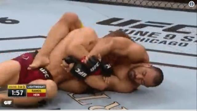Brasileiro fica nas costas de Hein e encaixa estrangulamento. Alemão tenta se defender, mas não resiste e bate.