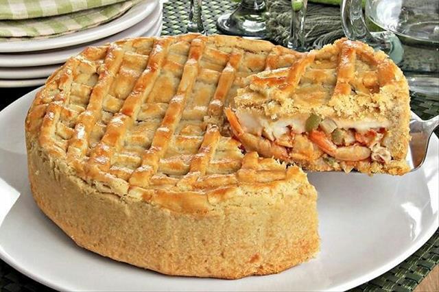 Misture todos os ingredientes numa bacia grande e sove bem com as mãos. A massa não pode ficar muito seca. Depois de bem sovada. faça uma bolinha e sinta a massa um pouco úmida(faça um furo no meio com o dedo, a massa não pode rachar). Deixe descansar na bacia tampada com um pano de prato na geladeira por uma hora. Depois forre um tabuleiro médio(fundo e laterais) com a massa. Coloque o recheio e tampe com massa também. Pincelar uma gema(sem a película). Leve ao forno pré aquecido por mais ou menos uns 40 minutos ou até ficar bem douradinho.