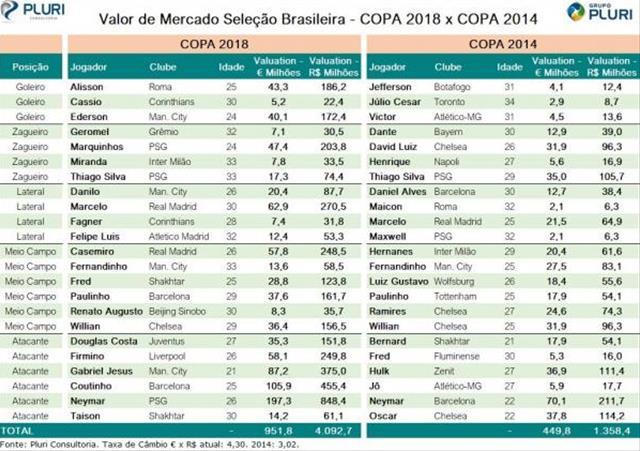 Os 23 convocados pelo técnico Tite para a Copa do Mundo da Rússia têm somados o valor de mercado de R$ 4 bilhões, segundo estudo da Pluri Consultoria. O grupo convocado para a Copa do Mundo de 2014, por Felipão, tinha valor total de R$ 1,3 bilhão.