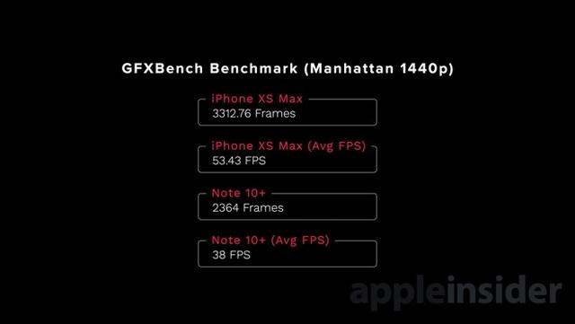 Our last graphics test was the GFXBench benchmark which utilizes a variety of tests to strain the devices from a graphical processing perspective. Running the 1440p Manhattan test, the iPhone XS Max earned 3312.76 frames at 53.43 fps, against the Galaxy Note 10+ which pulled 2364 frames at 38 fps. It's a close one, but the iPhone XS Max won again here.