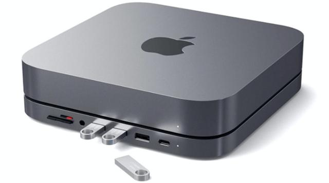 The new Satechi aluminum hub is made to precisely fit underneath the Mac mini and also act as a stand. It brings a series of ports, including a micro SD card reader, to the front of the computer.
