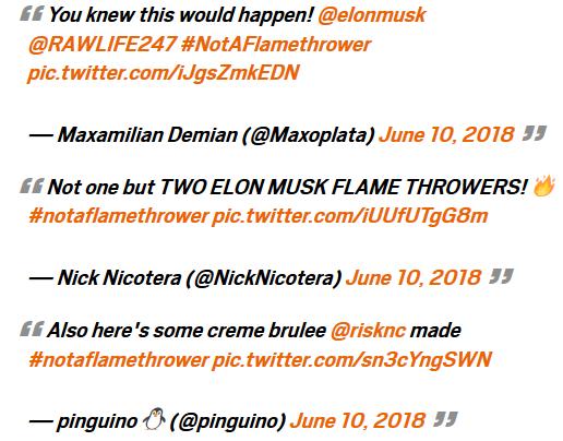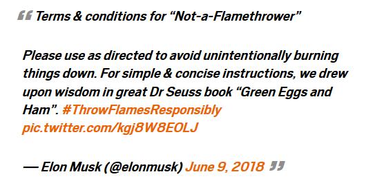 Strictly speaking, Musk’s creation is not actually a flamethrower because it only shoots fire for a short distance.
