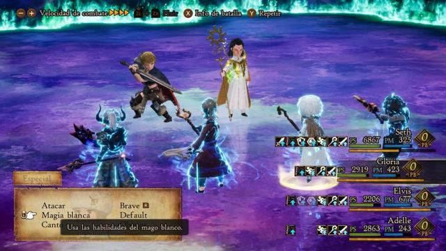 Siempre que hay más de un enemigo, es mejor centrarse en uno de ellos. En este caso, nuestro primer objetivo debe ser Helio ya que es capaz de curarse a sí mismo y a Gladia. Para ello, es recomendable llevar a un Mago rojo que no sea Adelle, pues esta todavía no es capaz de lanzar especiales. Y es que el Mago rojo no solo podrá lanzar un potente especial de viento que afectará gravemente a Helio, sino que también lanzará grandes hechizos de tierra para Gladia. Además, si este último está bien entrenado, tendrá la habilidad Hechizo en cadena aprendida, que hará que lance dos hechizos sin coste adicional por turno.