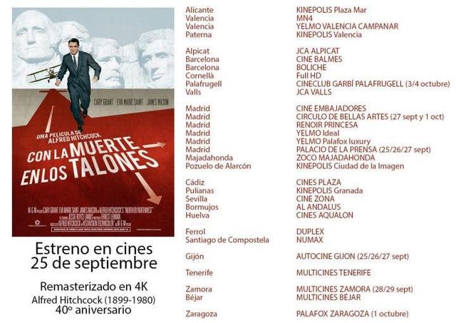 Es una de las películas más importantes dentro de la filmografía del maestro del suspense, Alfred Hitchcock, y está protagonizado por dos grandes estrellas de la época dorada de Hollywood, Cary Grant y Eva Marie Saint. Una cinta imperdible en la que encontramos momentos absolutamente icónicos dentro del cine como esa espectacular escena huyendo de la avioneta. La película se podrá ver en una versión remasterizada en 4k, en los cines que aparecen en la imagen, a partir del 25 de septiembre.