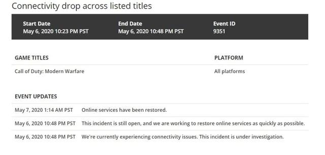 Ayer por la noche el problema fue a más y los jugadores no solo tenían que esperar mucho tiempo para encontrar partida sino que a otros se les echó del juego con un mensaje de error cuando se intentaban conectar al online. Activision actualizó su página de soporte reconociendo los problemas en PlayStation 4, Xbox One y PC e indicando que estaban investigando lo ocurrido. Unas horas después la compañía actualizó de nuevo la página anunciando que el servicio online había sido restaurado, por lo que los problemas de conexión deberían estar resueltos.