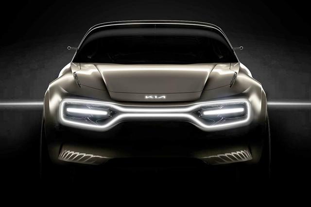 From the front, Kia’s latest concept seems to be coupe-shaped although it’s unclear whether the car has a two or four-door layout. The teased model adheres to the sporty rule book, with its wide track, flared wheel arches, low ride height, long bonnet and low roofline. Other features include LED headlights, rear-view cameras in place of wing mirrors and a MkI Ford Escort-esque dog-bone grille with a wrap-around light bar.