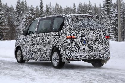 Our spy photographers have caught the next-generation Volkswagen Transporter van during winter testing, spied here in Caravelle guise.