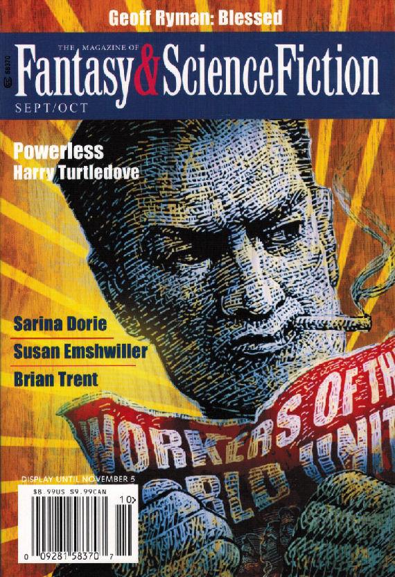For this week’s review, I am pleased to bring you what I consider to be a very strong issue of The Magazine of Fantasy and Science Fiction! The cover is by Michael Garland, illustrating the story “Powerless,” by Harry Turtledove. As with many of Turtledove’s works, the story deals with an alternate universe United States, more akin to Soviet Russia in the 1940s and 1950s, than the U.S.—or maybe it’s a cautionary tale about what the U.S. might become. It’s a cross between 1984 and, I dunno, The Man in the High Castle. But rather than a dreary, Communist Britain, or a U.S. divided by conquerors, our hero Charlie Simpkins lives in Southern California—West Coast People’s Democratic Republic. In the San Fernando Valley, to be exact. But it’s a Southern California that would be instantly recognizable to anyone who lived through the Berlin partition (on the East side), where you have to toe the Party line and spout the Party line, and post the Party posters.