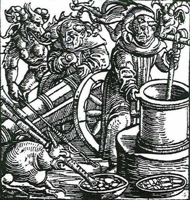 下の写真は、ドイツの錬金術師ベルトルド・シュワルツが火薬を作っている様子を示し、助手は大砲の製作に携わっています。