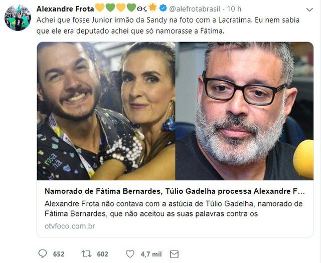 “Achei que fosse Junior irmão da Sandy na foto com a Lacratima. Eu nem sabia que ele era deputado achei que só namorasse a Fátima.”, disse em um dos vários tweets que soltou ao longo do dia.