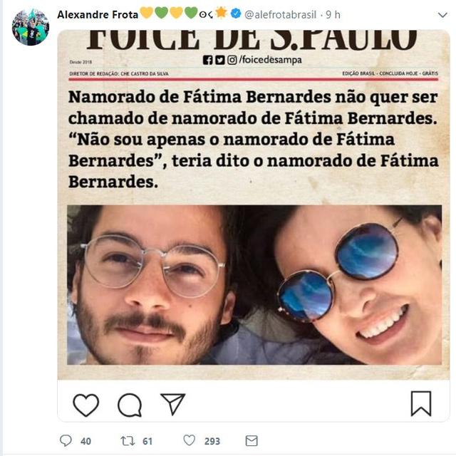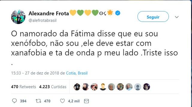 Confira os posts feitos no Twitter em que Frota rebate acusação de xenofobia e ironiza o namorado de Fátima Bernardes: