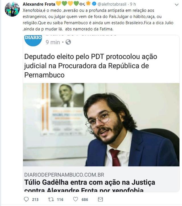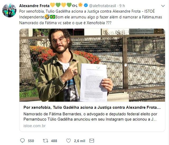 Túlio Gadêlha, namorado de Fátima Bernardes e recém eleito deputado federal (PDT) por Pernambuco acionou na Justiça, nesta quinta-feira (27), o também recém eleito deputado federal Alexandre Frota (PSL) por xenobobia.