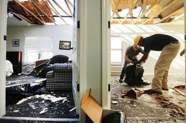 David Hassen and Hugh Foster, with Servicemaster in Tupelo, Miss., work on cleaning up debris in the residents rooms at Generations Senior Living, Tuesday morning, Nov. 6, 2018. The senior living facility was hit by a possible tornado late Monday night with the building suffering major roof damage. (Adam Robison/The Northeast Mississippi Daily Journal via AP) less