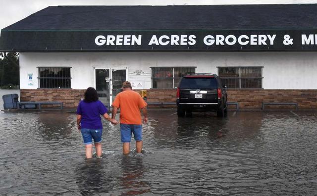 Doug Mathew and Tina Mathew hold hands while wading through the parking lot at Fannett's Green Acres Grocery during Monday's flooding from Hurricane Harvey. Photo taken Monday, August 28, 2017 Guiseppe ... more