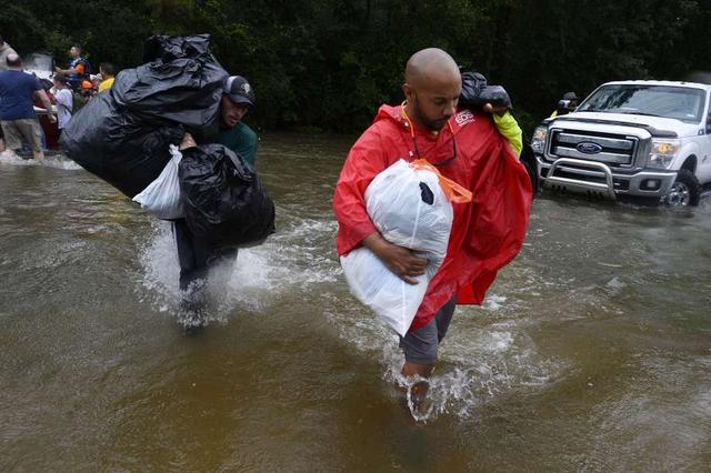 Volunteer Derek Burke, right, helps carry a family's belongings after boaters rescued them from flooding around Tram Road in Beaumont, Texas on Wednesday, Aug. 30, 2017. Photo taken Wednesday 8/30/17 Ryan ... more