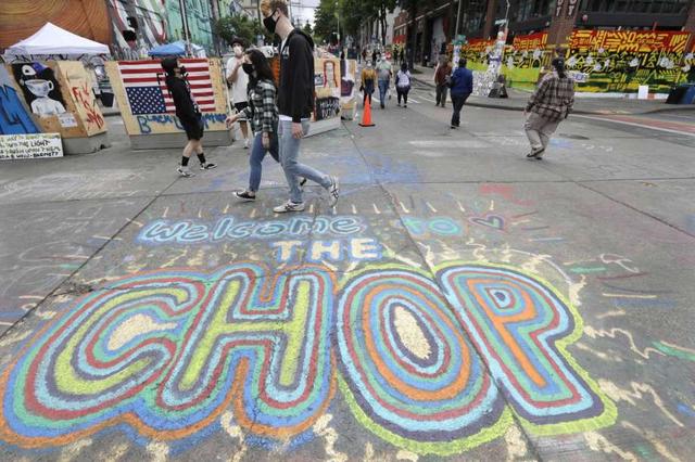 Pedestrians walk Sunday, June 21, 2020, in Seattle, where streets are blocked off in what has been named the Capitol Hill Occupied Protest (CHOP) zone. Police pulled back from several blocks of the city's Capitol Hill neighborhood near the Police Department's East Precinct building earlier in the month after clashes with people protesting the death of George Floyd. less