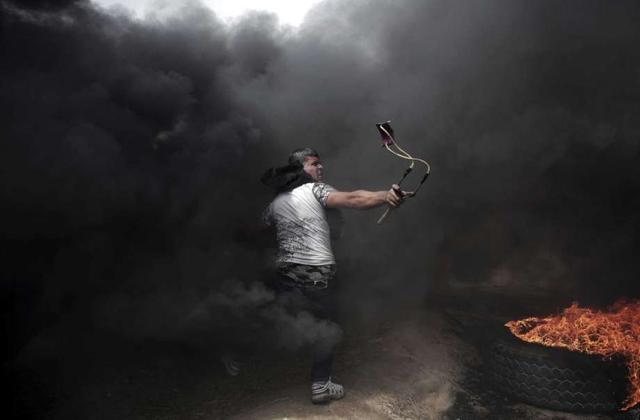 FILE - In this April 20, 2018 file photo, a Palestinian protester hurls stones at Israeli troops during a protest at the Gaza Strip's border with Israel.