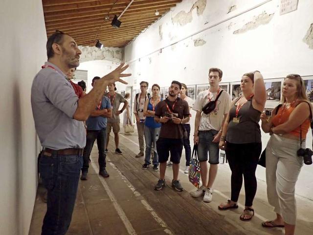 In this Sept. 5, 2018 photo, Associated Press photojournalist Khalil Hamra speaks to students during his 'Why Gaza?' exhibition at the 30th annual Visa Pour L’Image photo festival in Perpignan, France.