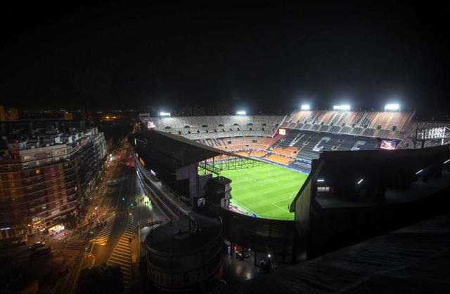 The stadium of Mestalla stadium is lit during the Champions League round of 16 second leg soccer match between Valencia and Atalanta in Valencia, Spain, Tuesday, March 10, 2020. The stadium is empty because of the coronavirus outbreak. less