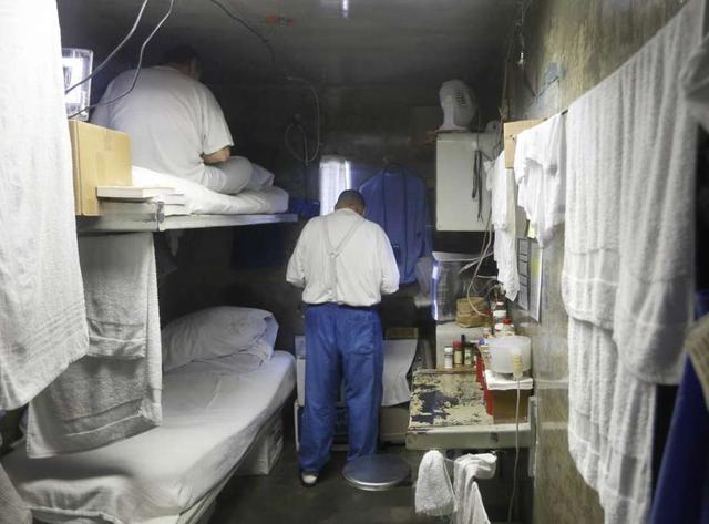 FILE - This Feb. 26, 2013 file photo, shows inmates in a cell at California State Prison, Sacramento, near Folsom, Calif. California will reconsider life sentences for thousands of nonviolent third-strike criminals by allowing them to seek parole under a ballot measure approved by voters two years ago. Court documents obtained by the Associated Press on Thursday, Oct. 18, 2018 show Gov. Jerry Brown's administration will include the repeat offenders in Proposition 57's early release program. less