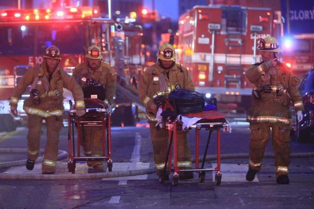 LOS ANGELES (AP) — Investigators on Monday began combing the wreckage of a fire and explosion at a downtown Los Angeles hash oil manufacturer as eight burned firefighters remained in the hospital.