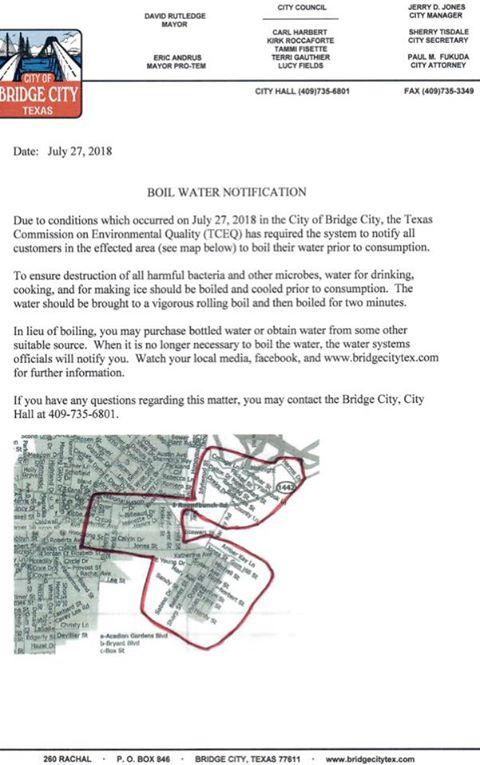 Bridge City has issued a boil water notice for parts of East Roundbunch Road, Jones Street and neighboring areas.